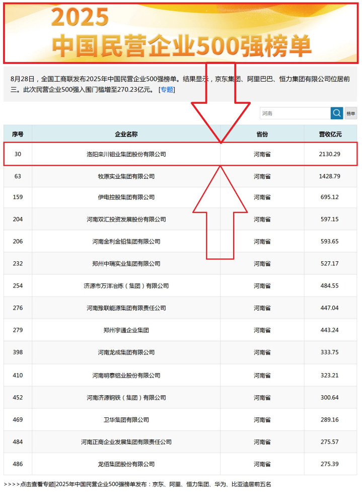 2025年8月,中国民营企业500强榜单发布,洛阳栾川钼业集团股份有限公司(下称“洛阳钼业”)以2130.29亿元营收位列全国第30位,高居河南省榜首,也是河南省唯一一家年营收突破2000亿的企业。